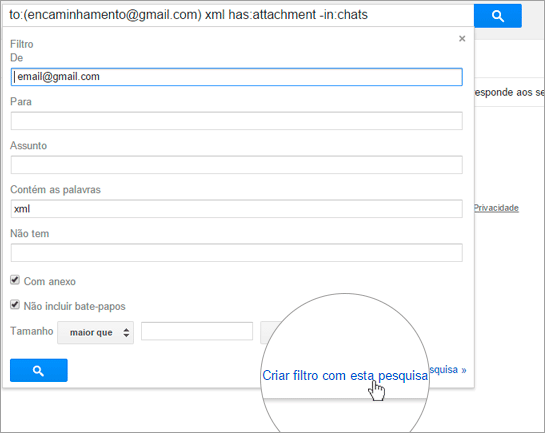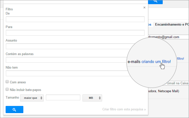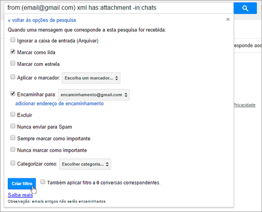 2 - Preencha o filtro com as condições que desejar para realizar o encaminhamento e clique em Criar filtro com esta pesquisa >>