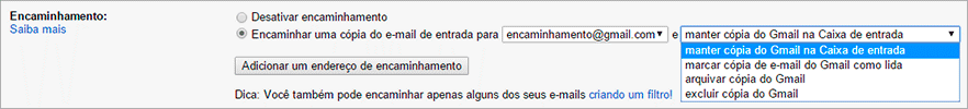 - manter cópia do Gmail na Caixa de entrada: Nada será feito com o e-mail encaminhado;