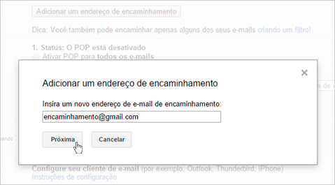 3 - Adicione o endereço de e-mail para onde deseja encaminhar automaticamente os e-mails que receber em sua conta Gmail e clique em Próxima :